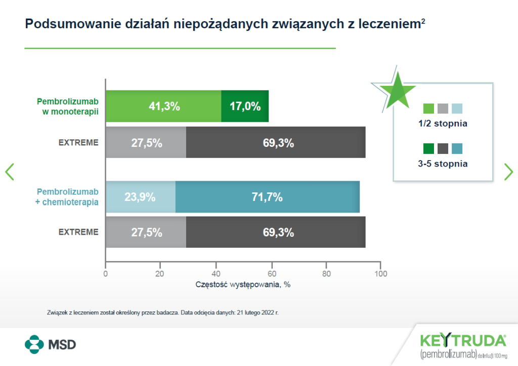 Działania niepożądane stopni 3-5 u pacjentów z NDRP występowały z częstością wynoszącą 69% w grupie stosującej leczenie skojarzone z pembrolizumabem i 61% w grupie stosującej tylko chemioterapię. U pacjentów z HNSCC występowały one z częstością wynoszącą 85% w grupie stosującej leczenie skojarzone z pembrolizumabem i 84% w grupie otrzymującej chemioterapię z cetuksymabem, u pacjentów z rakiem przełyku występowały one z częstością wynoszącą 86% w grupie stosującej leczenie skojarzone z pembrolizumabem i 83% w grupie stosującej tylko chemioterapię, u pacjentów z TNBC występowały one z częstością wynoszącą 80% w grupie stosującej leczenie skojarzone z pembrolizumabem i 77% w grupie stosującej tylko chemioterapię, u pacjentów z rakiem szyjki macicy występowały one z częstością wynoszącą 77% w grupie stosującej leczenie skojarzone